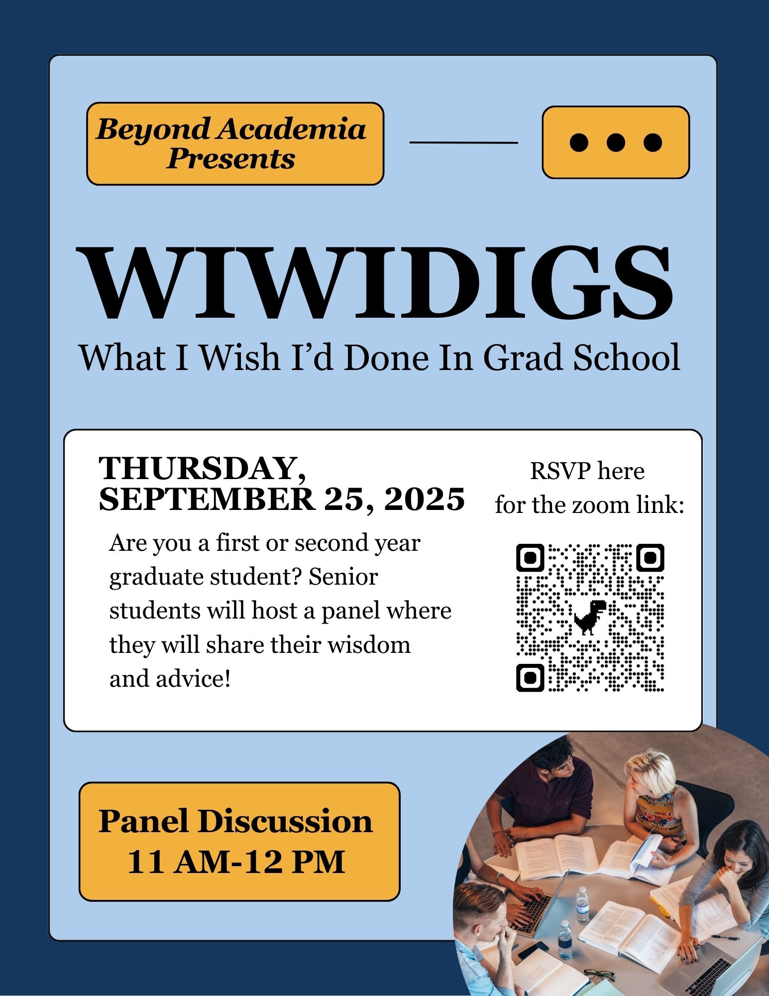 Join us for a panel discussion on Zoom where senior graduate students across multiple disciplines are ready to answer questions from early-stage graduate students